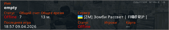 Играет на Counter Strike 1.6 сервере. Страна: УкраинаПервый раз замечен 11:32 22.03.2026