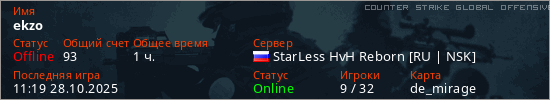Играет на Counter Strike Global Offensive сервере. Страна: РоссияПервый раз замечен 21:19 17.10.2025