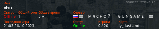 Играет на Counter Strike 1.6 сервере. Страна: РоссияПервый раз замечен 21:01 26.10.2023