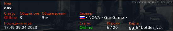 Играет на Counter Strike Source сервере. Страна: РоссияПервый раз замечен 21:22 09.03.2023