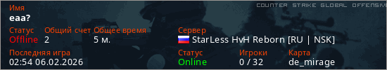 Играет на Counter Strike Global Offensive сервере. Страна: РоссияПервый раз замечен 02:33 06.02.2026