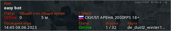 Играет на Counter Strike 1.6 сервере. Страна: РоссияПервый раз замечен 14:43 08.06.2023