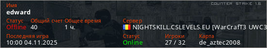Последний раз был в сети 10:00 04.11.2025 Игрок с таким ником замечен на 30 серверах