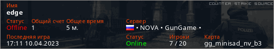 Играет на Counter Strike Source сервере. Страна: РоссияПервый раз замечен 17:03 10.04.2023