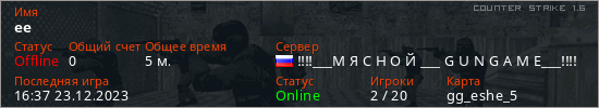 Играет на Counter Strike 1.6 сервере. Страна: РоссияПервый раз замечен 16:35 23.12.2023