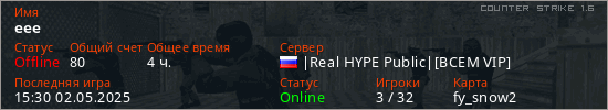 Играет на Counter Strike 1.6 сервере. Страна: РоссияПервый раз замечен 17:36 12.02.2025