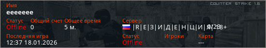 Играет на Counter Strike 1.6 сервере. Страна: РоссияПервый раз замечен 11:45 18.01.2026