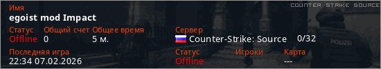 Играет на Counter Strike Source сервере. Страна: РоссияПервый раз замечен 22:24 07.02.2026