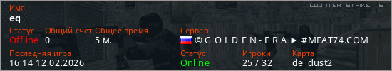 Играет на Counter Strike 1.6 сервере. Страна: РоссияПервый раз замечен 16:09 12.02.2026