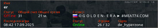 Играет на Counter Strike 1.6 сервере. Страна: РоссияПервый раз замечен 10:56 26.07.2023