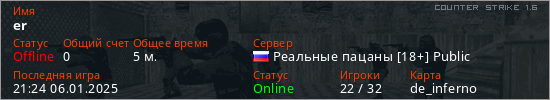 Играет на Counter Strike 1.6 сервере. Страна: РоссияПервый раз замечен 21:09 06.01.2025