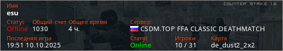 Играет на Counter Strike 1.6 сервере. Страна: РоссияПервый раз замечен 21:57 18.04.2020
