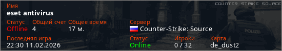 Играет на Counter Strike Source сервере. Страна: РоссияПервый раз замечен 17:40 08.02.2026