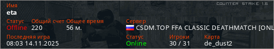 Последний раз был в сети 08:03 14.11.2025 Игрок с таким ником замечен на 2 серверах