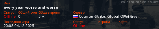 Играет на Counter Strike Source сервере. Страна: РоссияПервый раз замечен 19:54 04.12.2025