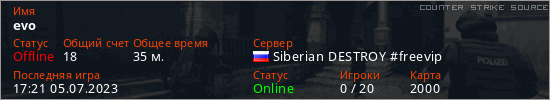 Играет на Counter Strike Source сервере. Страна: РоссияПервый раз замечен 14:53 26.02.2023