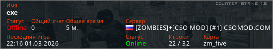 Играет на Counter Strike 1.6 сервере. Страна: РоссияПервый раз замечен 22:13 01.03.2026