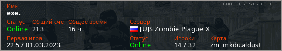 Играет на Counter Strike 1.6 сервере. Страна: РоссияПервый раз замечен 22:57 01.03.2023