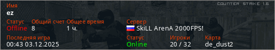 Последний раз был в сети 00:43 03.12.2025 Игрок с таким ником замечен на 45 серверах