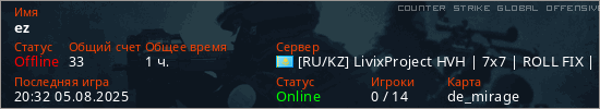 Играет на Counter Strike Global Offensive сервере. Страна: КазахстанПервый раз замечен 06:12 15.02.2025