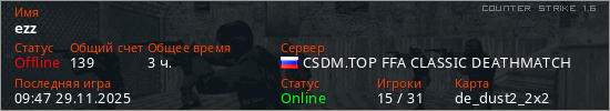 Играет на Counter Strike 1.6 сервере. Страна: РоссияПервый раз замечен 03:01 29.04.2020