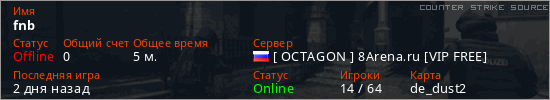 Играет на Counter Strike Source сервере. Страна: РоссияПервый раз замечен 20:15 24.12.2025