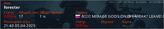 Играет на Counter Strike Global Offensive сервере. Страна: РоссияПервый раз замечен 14:25 08.04.2024