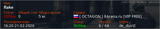 Играет на Counter Strike Source сервере. Страна: РоссияПервый раз замечен 16:18 21.02.2026