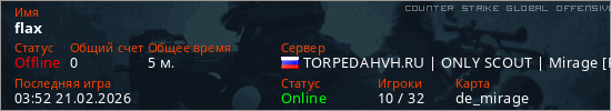 Играет на Counter Strike Global Offensive сервере. Страна: РоссияПервый раз замечен 03:48 21.02.2026