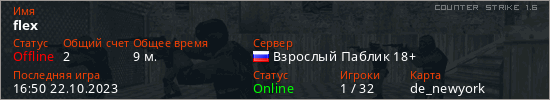 Играет на Counter Strike 1.6 сервере. Страна: РоссияПервый раз замечен 16:35 22.10.2023
