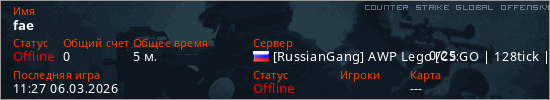 Играет на Counter Strike Global Offensive сервере. Страна: РоссияПервый раз замечен 10:45 06.03.2026