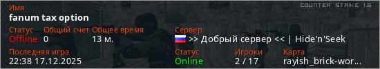 Играет на Counter Strike 1.6 сервере. Страна: РоссияПервый раз замечен 14:16 15.12.2025