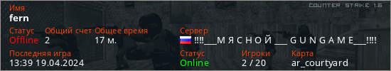 Играет на Counter Strike 1.6 сервере. Страна: РоссияПервый раз замечен 12:59 11.04.2024