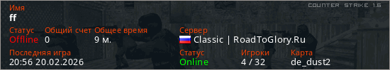 Играет на Counter Strike 1.6 сервере. Страна: РоссияПервый раз замечен 01:31 19.02.2026