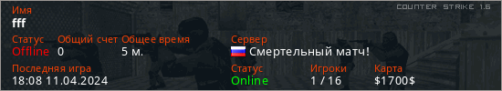 Играет на Counter Strike 1.6 сервере. Страна: РоссияПервый раз замечен 17:41 11.04.2024