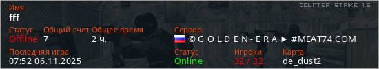 Последний раз был в сети 07:52 06.11.2025 Игрок с таким ником замечен на 46 серверах