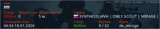 Играет на Counter Strike Global Offensive сервере. Страна: РоссияПервый раз замечен 03:56 18.01.2026