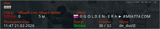 Играет на Counter Strike 1.6 сервере. Страна: РоссияПервый раз замечен 11:45 21.02.2026