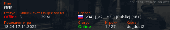 Играет на Counter Strike Source сервере. Страна: РоссияПервый раз замечен 13:38 06.11.2023