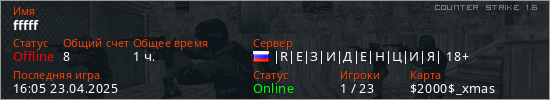 Играет на Counter Strike 1.6 сервере. Страна: РоссияПервый раз замечен 11:24 08.11.2024