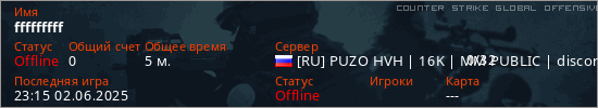 Играет на Counter Strike Global Offensive сервере. Страна: РоссияПервый раз замечен 23:13 02.06.2025