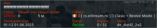 Играет на Counter Strike 1.6 сервере. Страна: РумынияПервый раз замечен 01:05 01.06.2025