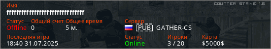 Играет на Counter Strike 1.6 сервере. Страна: РоссияПервый раз замечен 18:31 31.07.2025