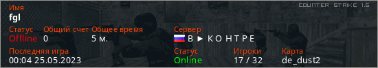 Играет на Counter Strike 1.6 сервере. Страна: РоссияПервый раз замечен 00:02 25.05.2023