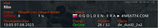 Играет на Counter Strike 1.6 сервере. Страна: РоссияПервый раз замечен 17:47 09.07.2024