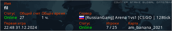 Играет на Counter Strike Global Offensive сервере. Страна: РоссияПервый раз замечен 22:48 31.12.2024