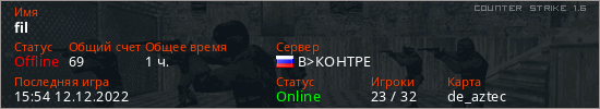Играет на Counter Strike 1.6 сервере. Страна: РоссияПервый раз замечен 15:50 28.09.2022