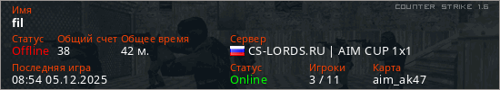 Играет на Counter Strike 1.6 сервере. Страна: РоссияПервый раз замечен 10:04 24.08.2024