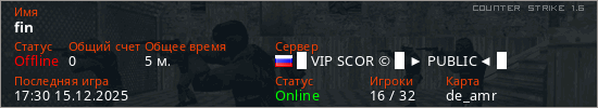 Играет на Counter Strike 1.6 сервере. Страна: РоссияПервый раз замечен 17:28 15.12.2025