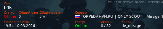 Играет на Counter Strike Global Offensive сервере. Страна: РоссияПервый раз замечен 19:52 10.03.2026